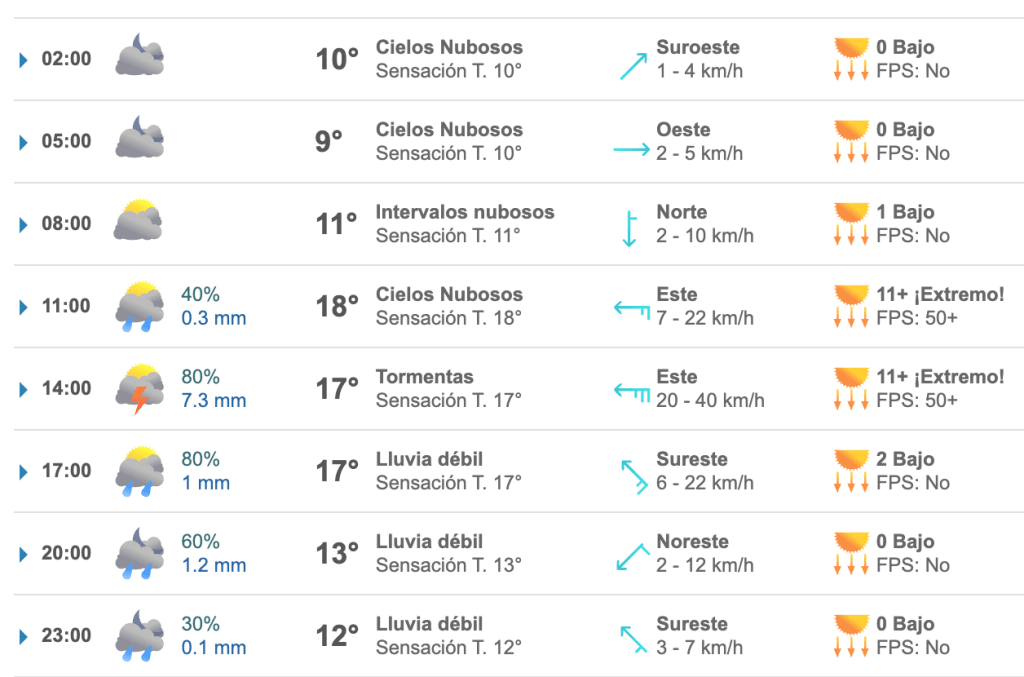 Cielo nublado la mayor parte del día. Lluvias matutinas y ambiente fresco, con bancos de niebla en zonas altas, así como temperaturas frías al amanecer en zonas montañosas del Estado de México. Chubascos y lluvias puntuales fuertes por la tarde en la Ciudad de México y en el Estado de México, acompañadas de descargas eléctricas. Ambiente vespertino fresco a templado. Viento de componente este de 10 a 25 km/h con rachas de 30 a 40 km/h. La temperatura mínima en la Ciudad de México será de 12 a 14 °C y la máxima de 22 a 24 °C.