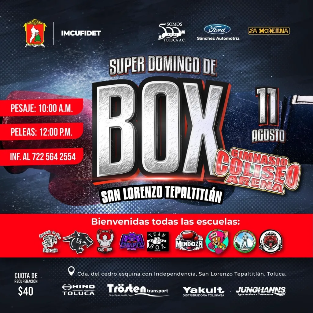 Si eres aficionado al boxeo, no te puedes perder este emocionante evento que reunirá a diferentes escuelas de Toluca. ¡Ven y apoya a los talentos locales en una jornada llena de energía y adrenalina!