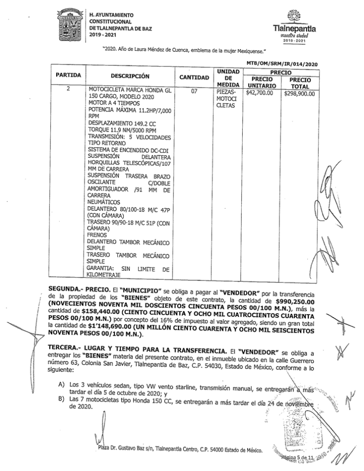 En el mismo contrato con folio MTB/OM/SRM/IR/014/2020 se acuerda la compra de siete motocicletas tipo Honda y cilindrada de 150 con valor unitario de 42 mil 700 pesos; y 298 mil 900 pesos por las tres motos.