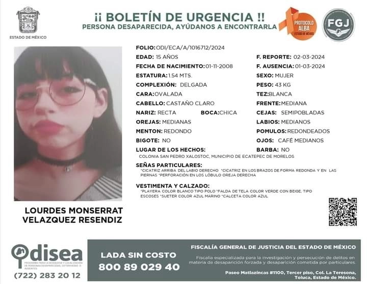Lourdes Monserrat, de 15 años, desapareció el 1 de marzo en Ecatepec, vistiendo una playera blanca tipo polo, falda de tela verde con beige, suéter azul marino y calcetas rojas.