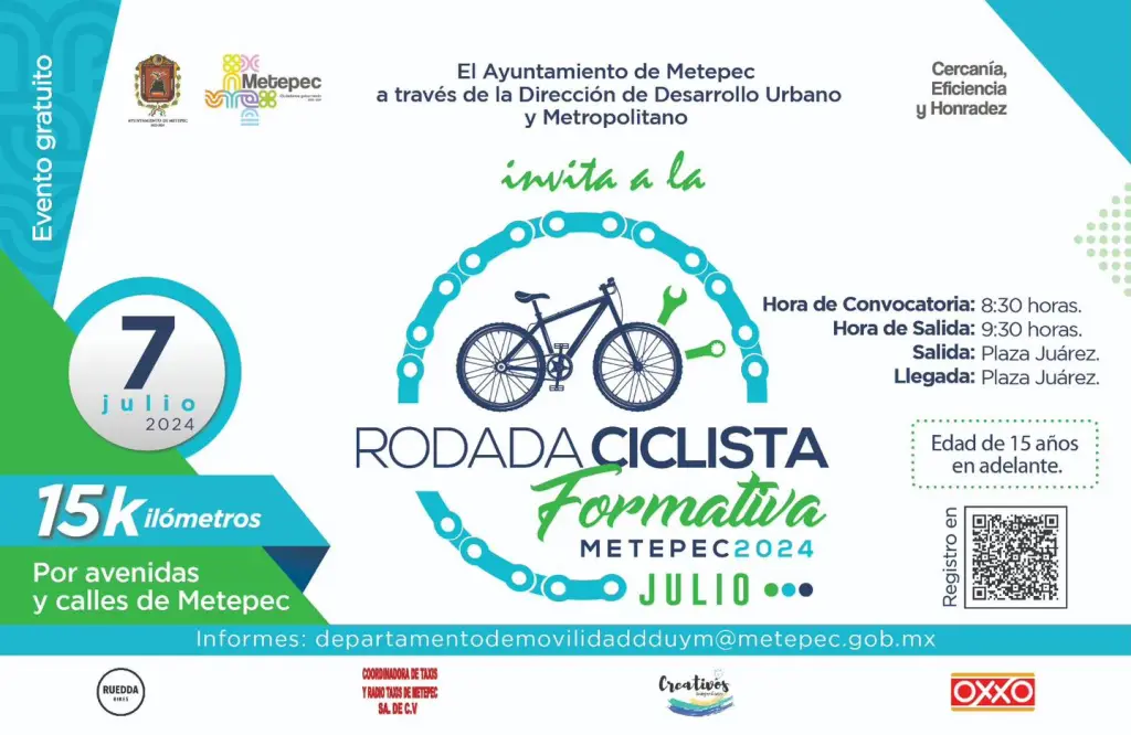 El ayuntamiento de Metepec invita a los ciclistas a ser parte de la Rodada Ciclista Formativa 2024 de 15 kilómetros. Podrán participar las personas de 15 años en adelante.