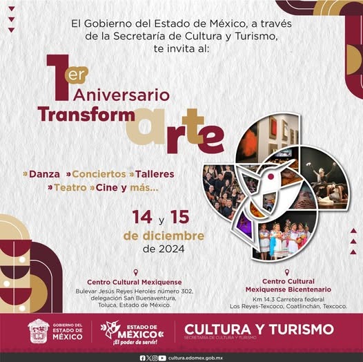 - TransformArte: Este 14 y 15 de diciembre, el Centro Cultural Mexiquense ofrece danza, conciertos, talleres, teatro y cine. ¡Un fin de semana cultural para toda la familia!