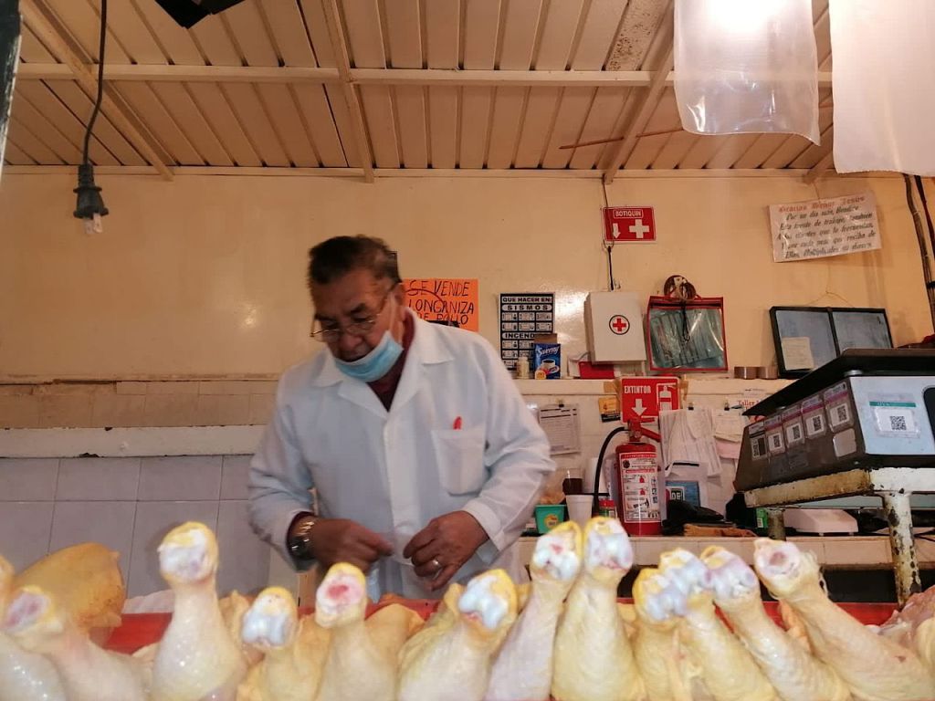 José Álvaro Vilchis vende pollo desde hace 40 años en el Mercado Juárez, en Toluca; sin embargo, su negocio está en riesgo porque el costo del producto ha incrementado más del 80 por ciento, de acuerdo con los comercializadores.