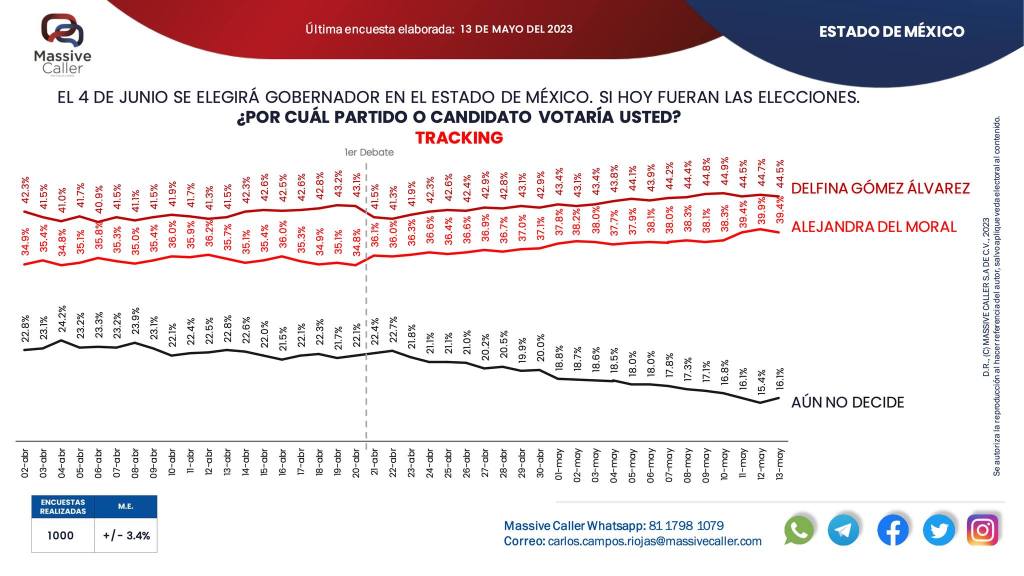 Alejandra del Moral aparece a cinco puntos de distancia de su contrincante Delfina Gómez en la encuesta del 13 de mayo de Massive Caller sobre las preferencias de la ciudadanía en las elecciones de la gubernatura del Estado de México. Desde el 8 de mayo la priista ha impulsado el mensaje en sus eventos y redes sociales de que empató a la abanderada de Morena, sin embargo, hasta el momento no ha difundido material que respalden sus dichos.