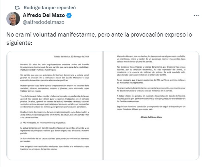 A Rodrigo Jarque, quien fue secretario de Finanzas del gobierno de Alfredo Del Mazo, sus muestras de apoyo solo alcanzaron para un “retuit” a la carta de respuesta del exgobernador ante su expulsión del partido.