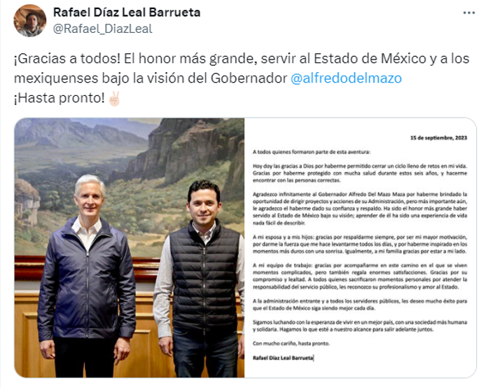 Rafael Díaz Leal Barrueta, exsecretario de Secretaría de Desarrollo Urbano y Obra, se refirió por última vez a Alfredo Del Mazo el día que terminó su gobierno. Este es su penúltimo post.