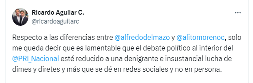 Ricardo Aguilar Castillo, expresidente del PRI mexiquense, identificado con el grupo de Enrique Peña —basta con ver su foto de perfil en sus redes sociales— descalificó lo que llamó “lucha de dimes y diretes”, criticando a ambos protagonistas del desencuentro tricolor.