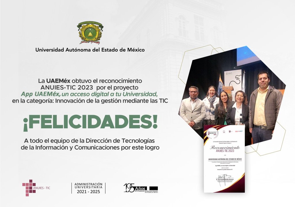 El reconocimiento que obtuvo la UAEMex fue en la categoría Innovación a la gestión mediante las TIC y lo otorga la Asociación Nacional de Universidades e Instituciones de Educación Superior (ANUIES), a través de su Comité de Tecnología.