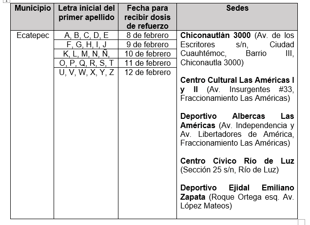 La aplicación de la dosis de refuerzo contra el covid-19 en Ecatepec será para la población de 50 a 59 años de edad y se llevarán a cabo en un horario de 9:00 a 17:00 horas.