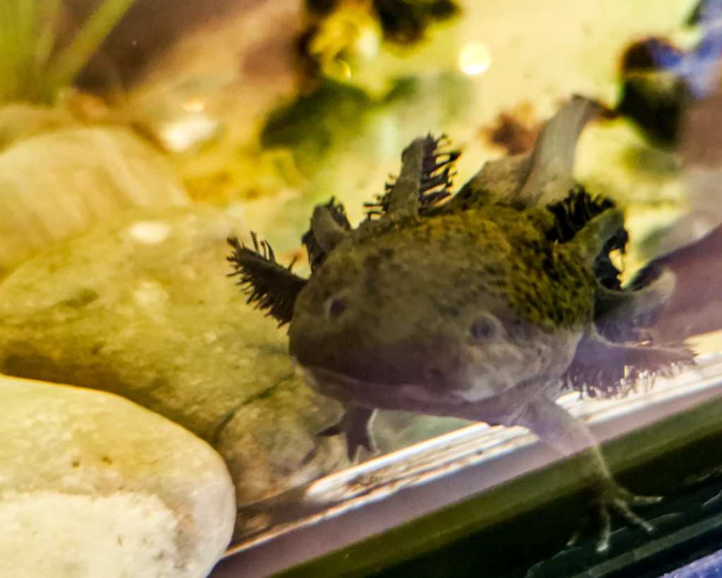 Aquí se pueden observar siete especies diferentes de este animal. El ajolote, a diferencia de anfibios como salamandras y ranas, no presenta metamorfosis. Además, son capaces de regenerar todas las partes de su cuerpo, lo que los ha hecho objeto de múltiples estudios científicos.