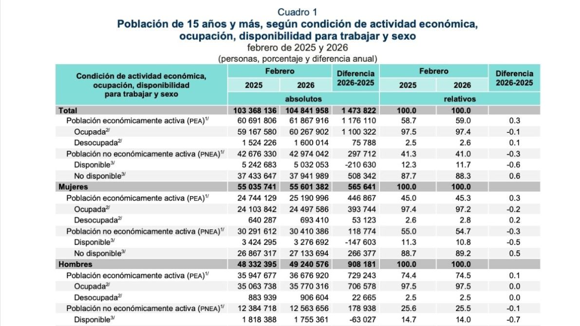 La población ocupada fue de 24.5 millones de mujeres y 35.8 millones de hombres, con un crecimiento anual conjunto de 1.1 millones de personas. En la informalidad, las mujeres registraron una ligera disminución de 0.2% pasando de 55.0% a 54.8%, mientras que en los hombres aumentó al pasar de 54.2% en 2025 a 54.8% en 2026.