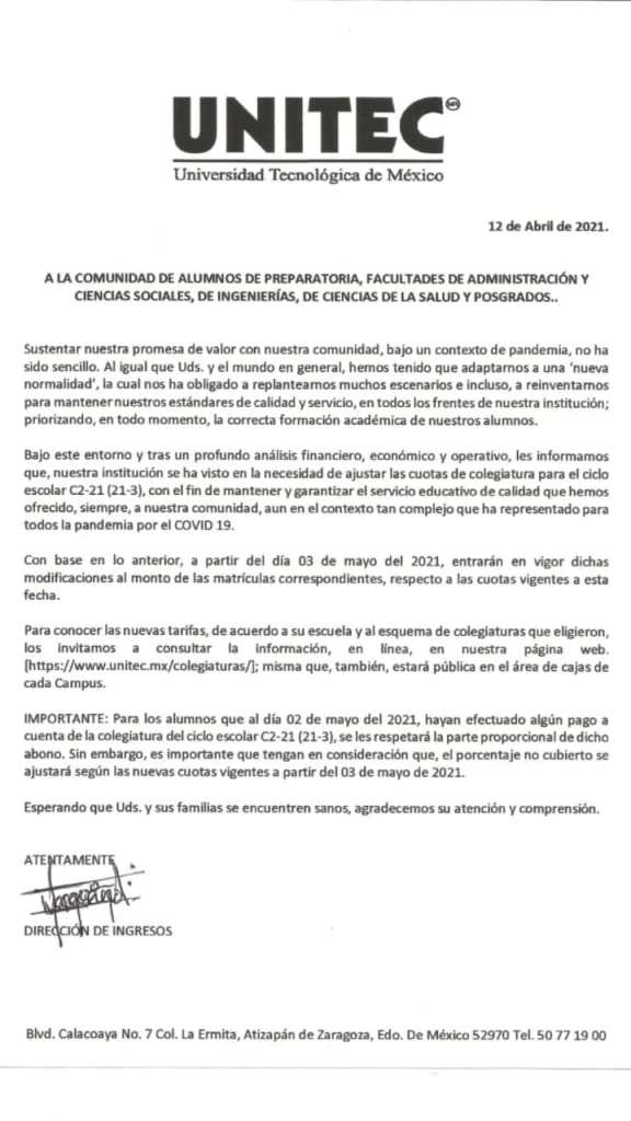 De acuerdo con un con un comunicado fechado el pasado 12 de abril la Unitec informó que debido a la pandemia dicha institución “se ha visto en la necesidad de ajustar las cuotas de la colegiatura para el ciclo escolar C2-21 (21-3)”.