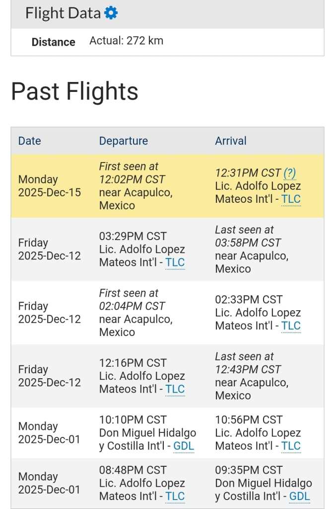 El 12 de diciembre, despegó nuevamente de Toluca con rumbo a Acapulco. La aeronave completó el vuelo de ida y vuelta el mismo día y, posteriormente, volvió a despegar hacia Acapulco.