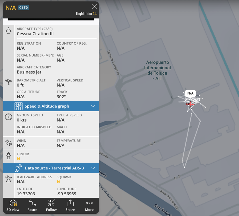Alrededor de las 14:30 horas, Protección Civil del Estado de México informó que el incidente aeronáutico ocurrido en San Pedro Totoltepec involucró un jet privado Cessna Citation III, matrícula XA-PRO, que había despegado de Acapulco con destino a Toluca.