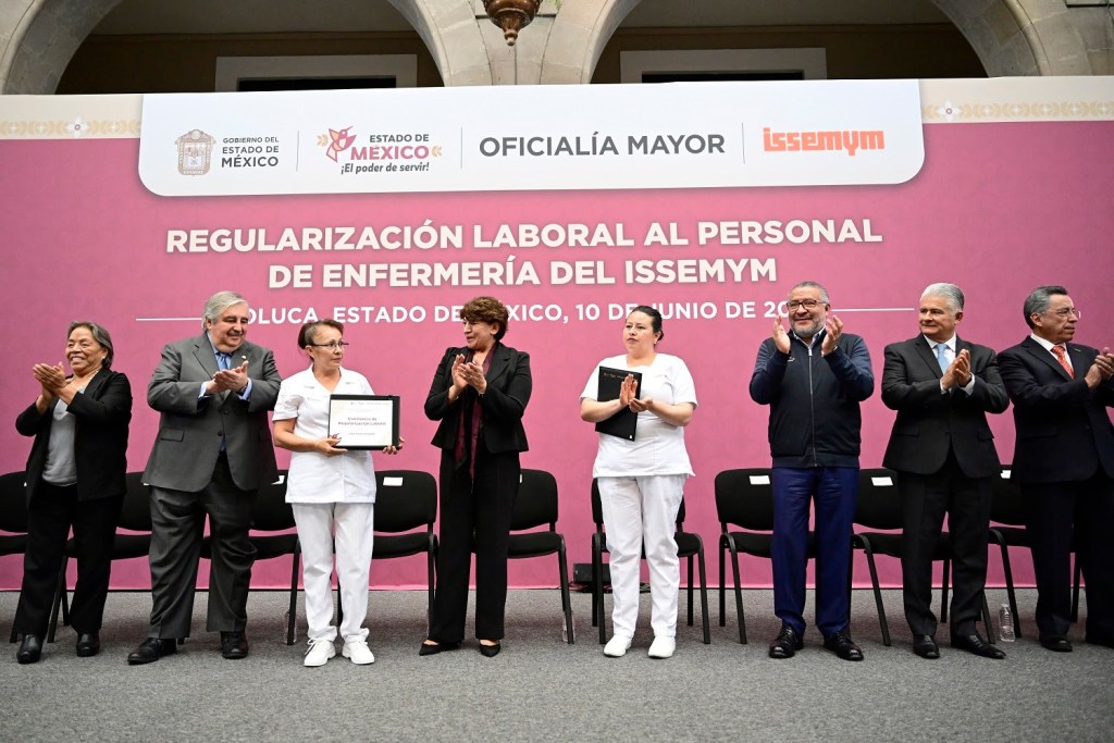La gobernadora del Estado de México (Edomex), Delfina Gómez, anunció la liberación de 100 plazas para basificación de personal del área de enfermería del Instituto de Seguridad Social del Estado de México y Municipios (ISSEMYM), que mantenían un contrato como eventuales. Adicionalmente, informó un aumento de salario a personal del instituto.