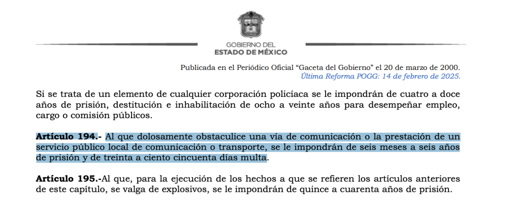 De acuerdo con el Código Penal del Estado de México, su artículo 194, indica: «Al que dolosamente obstaculice una vía de comunicación o la prestación de un servicio público local de comunicación o transporte, se le impondrán de seis meses a seis años de prisión y de treinta a ciento cincuenta días multa«.