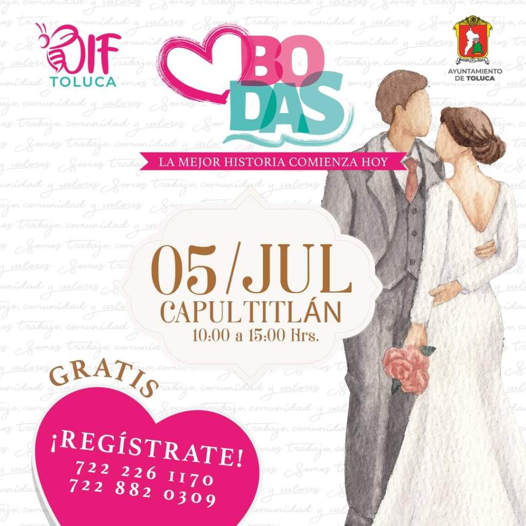 En un esfuerzo por celebrar el amor y la unión, el Sistema Municipal DIF de Toluca invita a todas las parejas a oficializar su compromiso en una Boda Comunitaria, una ceremonia festiva y accesible que se llevará a cabo el próximo 5 de julio en Capultitlán, de 10:00 a 15:00 horas.