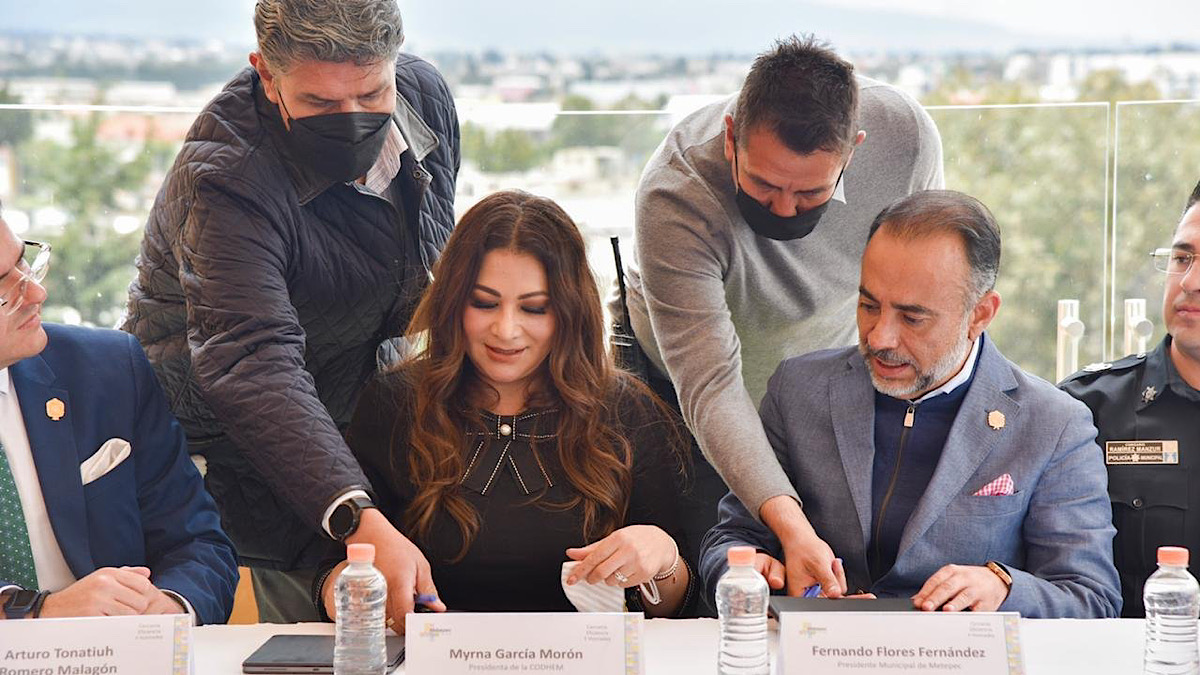 La presidenta de la Comisión de Derechos Humanos del Estado de México (Codhem), Myrna Araceli García Morón, y el presidente municipal de Metepec, Fernando Flores Fernández, establecieron el compromiso para que cada acto de la administración pública municipal, cada programa que emprenda y cada regulación que incluya en su Bando Municipal y en sus Códigos Reglamentarios tengan una perspectiva de derechos humanos que identifique, reconozca y potencialice el efecto transformador para el bienestar de las personas.