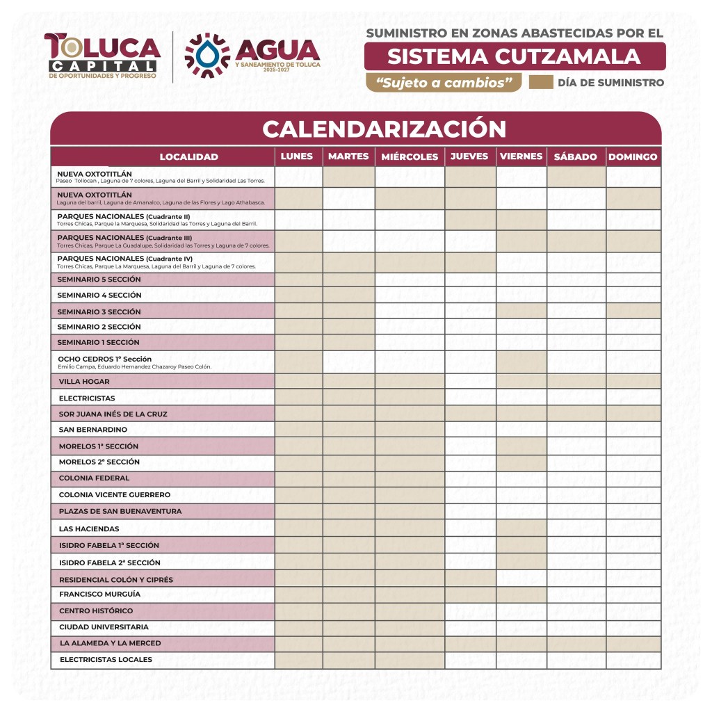 El gobierno de Toluca dio a conocer el calendario de suministro de agua para las zonas que dependen del Sistema Cutzamala. La programación establece los días de la semana en que cada colonia recibirá el servicio, con el fin de que las y los vecinos puedan organizar mejor su consumo y almacenamiento.