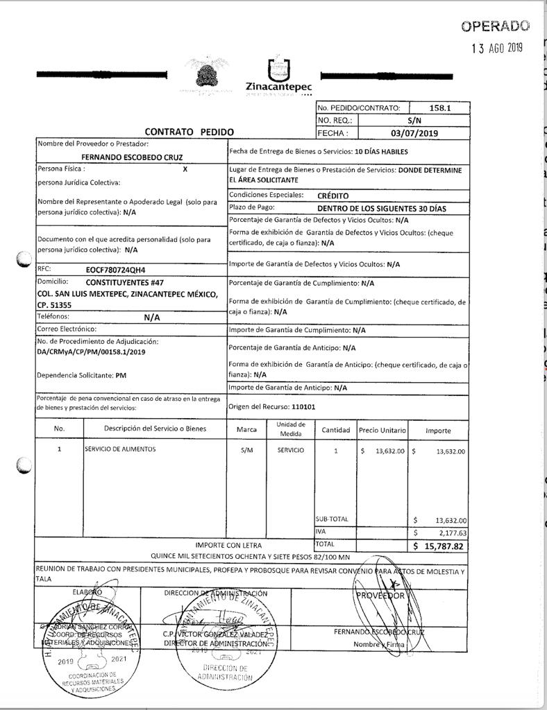 En este espacio se adjuntan copias de pagos y contratos que benefician a un ciudadano de Zinacantepec de nombre Fernando Escobedo Cruz, lo que confirmaría lo que expusieron regidores del ayuntamiento, en el sentido de que la actitud podría constituirse como una conducta antijurídica que se contempla en los artículos 428 y 430 del Código Penal.