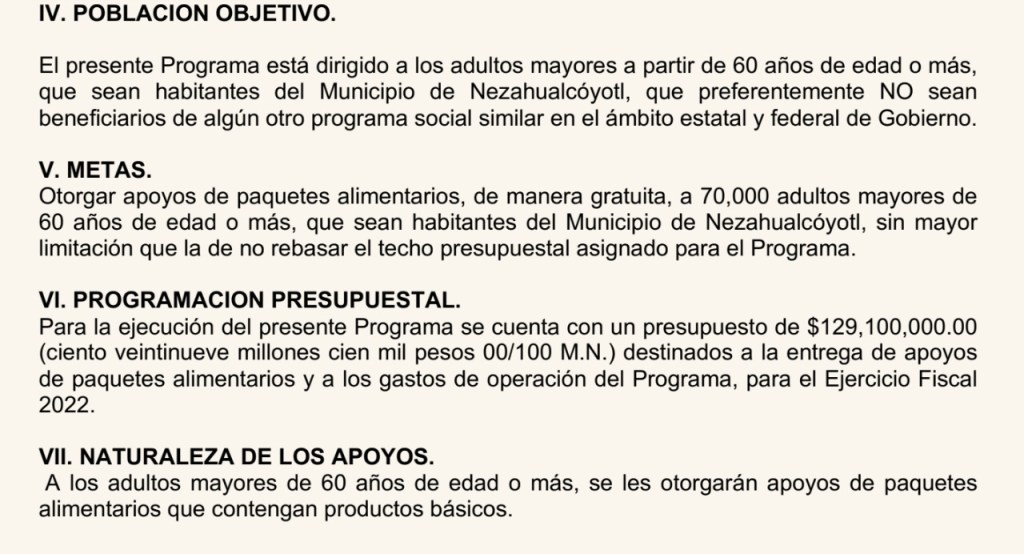 El primero es la Gaceta Municipal número 1 de la actual administración, que incluye las reglas de operación del programa. Este documento señala que los apoyos alimentarios para hasta 70 mil adultos serán por 129 millones 100 mil pesos durante el ejercicio 2022.