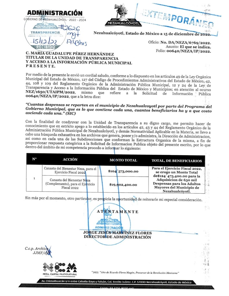 El tercer documento es la respuesta a la solicitud de información 00640/NEZA/IP/2022. Este señala que “Para el Ejercicio Fiscal 2022 se erogó un monto de 124 millones 475 mil 400 pesos, para la adquisición de 630 mil despensas para los adultos mayores del municipio de Nezahualcóyotl».