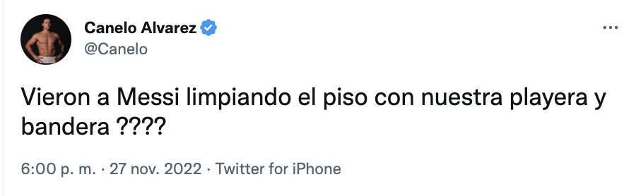 El campeón mundial de boxeo, Saúl «Canelo» Álvarez, compartió diversos tuits en contra del futbolista Lionel Messi. El boxeador arremetió contra el futbolista, argumentando que es una falta de respeto haber «pateado» la playera, e incluso, el solo hecho de tenerla en el suelo.