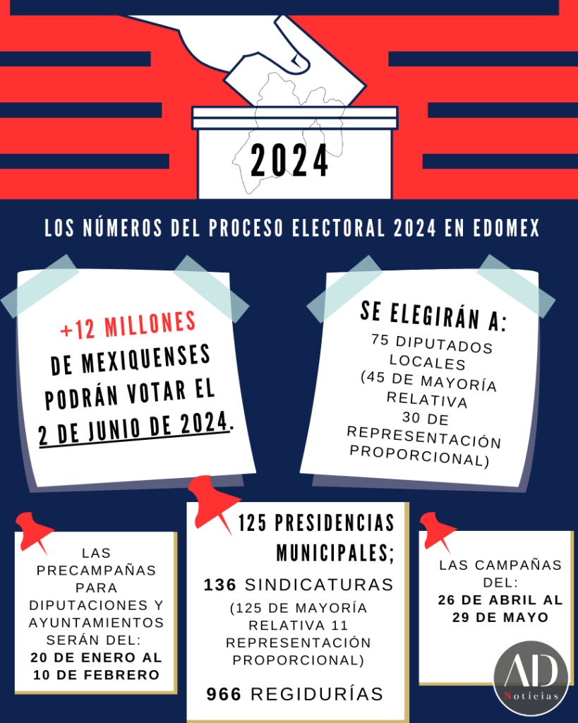 En este sentido, se elegirán un total de mil 302 cargos de elección popular en las elecciones de 2024 en Edomex: