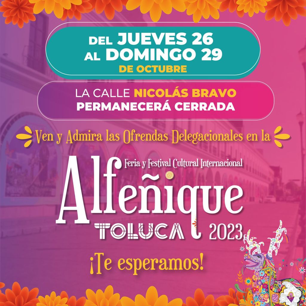 El Ayuntamiento de Toluca informó que la calle Nicolás Bravo permanecerá cerrada por la instalación de las ofrendas delegacionales en el marco de la Feria del Alfeñique 2023.