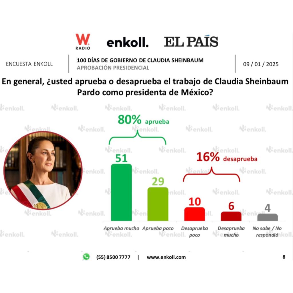 Claudia Sheinbaum registra un 80 % de aprobación popular tras sus primeros 100 días como presidenta de México, según una encuesta de Enkoll publicada por El País y W Radio. Este resultado refleja un incremento de cuatro puntos respecto al mes anterior, consolidando su popularidad.