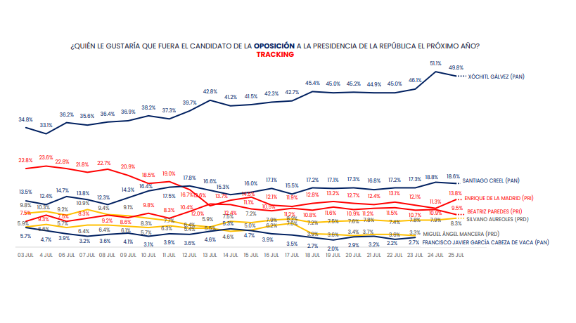 Cabe destacar que las preferencias electorales por Xóchitl Gálvez, según esta encuestadora, aumentaron considerablemente durante julio, frente a las de otros aspirantes de la oposición.