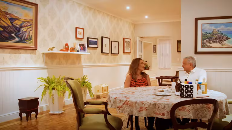 Durante una entrevista en junio de 2020, Andrés Manuel mostró parte de la decoración. En ese momento, el comedor y la sala destacaron por sus estructuras de madera y cojines de color verde. Los muros blancos contrastaban con los tonos cálidos del piso y las alfombras, y las paredes estaban adornadas con varios cuadros.