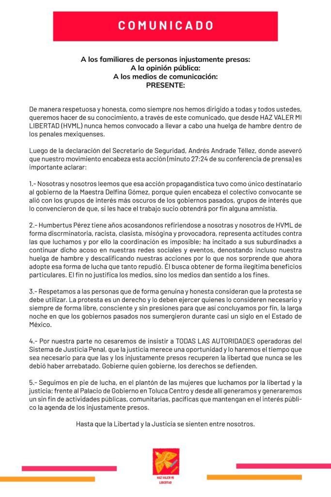 En un comunicado, las mujeres del colectivo Haz Valer Mi Libertad señalaron que la aseveración de Andrés Andrade Téllez, secretario de Seguridad del Edomex, de apuntarlas como líderes de huelga de hambre es totalmente falsa.