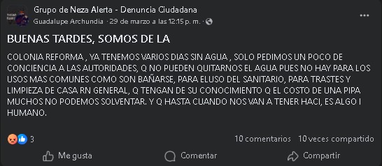 El problema no es reciente. Habitantes de Reforma y colonias cercanas han reportado falta de agua combinada con fallas en drenaje, lo que ha obligado a recurrir al suministro mediante pipas, que no siempre es suficiente ni constante.