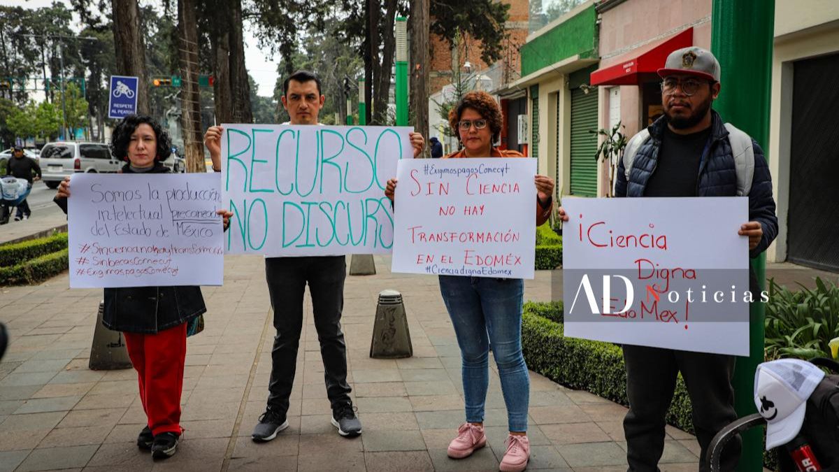 Los beneficiarios y beneficiarias del programa «Investigadoras e Investigadores Comecyt Edomex» se manifestaron en las instalaciones de Toluca del Consejo Mexiquense de Ciencia y Tecnología (Comecyt) exigiendo el pago pendiente de sus becas.
