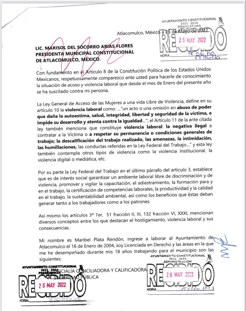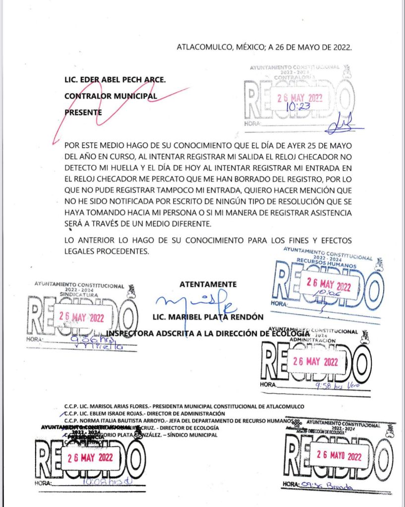 En entrevista, Maribel Plata Rendón –trabajadora del ayuntamiento de Atlacomulco– narró el proceso de despido, del cual no tienen una notificación formal por escrito: