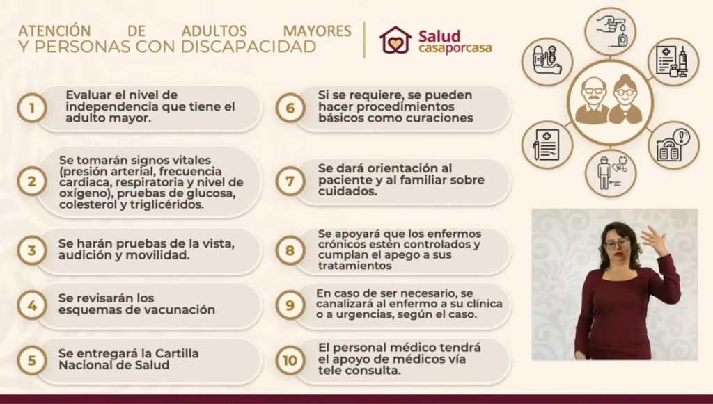 Las visitas incluirán revisión de signos vitales, pruebas de movilidad, visión y audición, así como la actualización de esquemas de vacunación. Se entregará la Cartilla Nacional de Salud y se realizarán curaciones menores. En caso necesario, se canalizará al paciente a una clínica u hospital. El personal contará con apoyo médico vía teleconsulta.