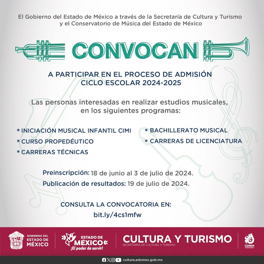 El Conservatorio de Música del Estado de México (COMEM) lanzó su convocatoria de admisión para el ciclo escolar 2024-2025, ofreciendo diversas oportunidades para estudiantes de primaria, secundaria y más niveles académicos.