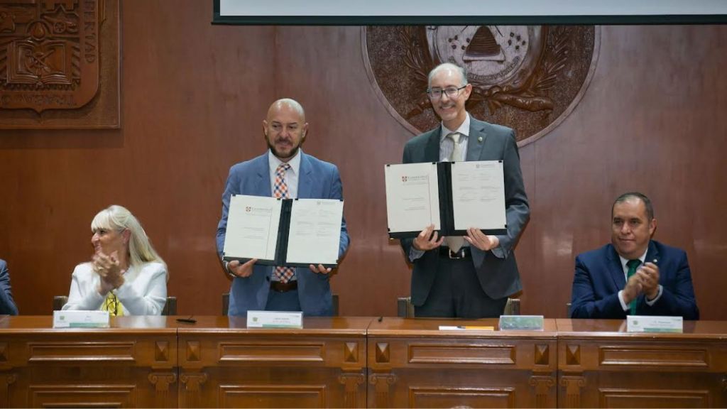 El rector de la Universidad Autónoma del Estado de México (UAEMex), Carlos Eduardo Barrera Díaz, y el director comercial en América de Cambridge University Press & Assesment, León David Zuna Orellano, firmaron el Acuerdo de Licencia de Socio Platinum Better Learning con el propósito de fortalecer las habilidades en el proceso de enseñanza-aprendizaje de la lengua inglesa.