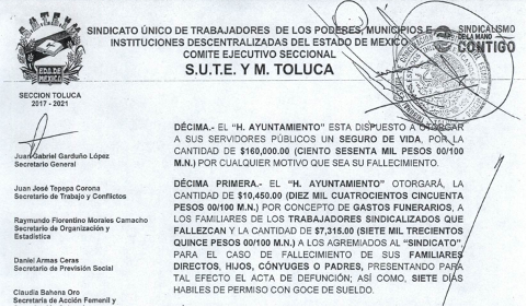 La prestación es de 10 mil 450 pesos que se entrega a los familiares de los trabajadores sindicalizados que fallecieron y 7 mil 315 pesos a los agremiados que sufrieron alguna pérdida dentro de su núcleo familiar, según se establece en el convenio de colaboración del Ayuntamiento y el S.U.T.E.y.M firmados en 2019, 2020 y 2021.