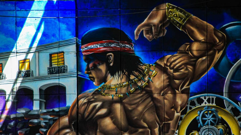 El mural que realizó Daniel destaca la figura del dios Tolo. Un guerrero fuerte que sostiene fuego en su mano, que representa el conocimiento.