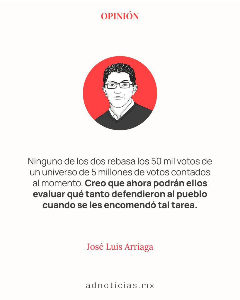 Cuando se termine el conteo y se oficialicen los datos, quizá ambos alcancen el 1%, pero sin duda es un signo de lo impopulares que son. Y resulta paradógico tratándose de quienes se desempeñaron como defensores del pueblo. De entre las cosas que emergieron de nuestra muy suigéneris elección judicial, están casos como este, en donde dos personajes como ellos aspiraron legítimamente a ocupar un lugar en el Poder Judicial, pero no lograron el respaldo del voto. Lo más lógico es pensar que ambos se sintieron con la capacidad y méritos suficientes para someterse al escrutinio de las urnas. También se puede deducir que ambos creyeron que su desempeño como ombudsperson les daba una especie de legitimidad para ser incluidos en la boleta. Durante su campaña para obtener el voto no estuvo ausente la alusión a su pasado como defensores del pueblo, como garantes de los derechos de la ciudadanía. Sin embargo, esta última les dijo no. Ninguno de los dos estuvo ni siquiera cerca de competir con los punteros en tales comicios. Ninguno de los dos rebasa los 50 mil votos de un universo de 5 millones de votos contados al momento. Son realmente magros sus resultados.