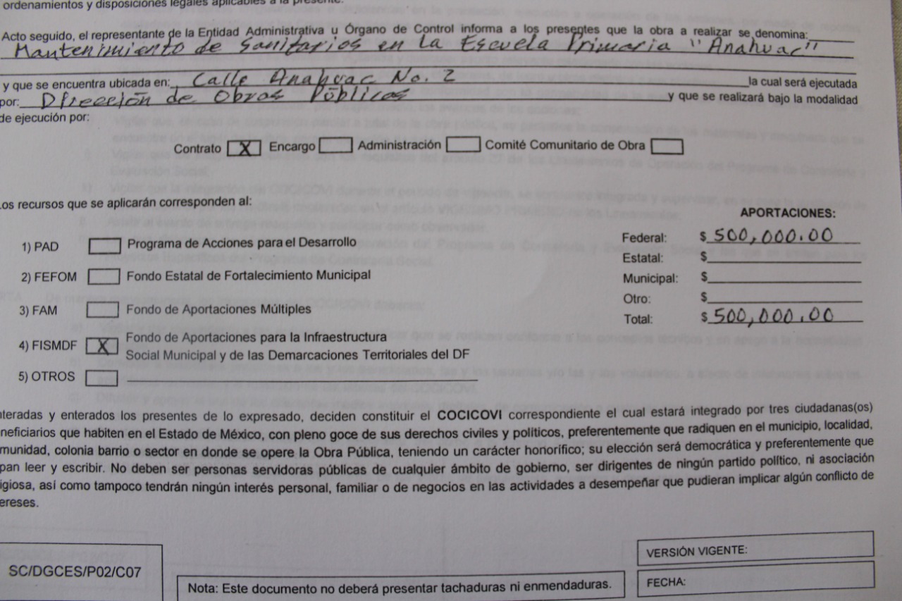 En esta sesión se aprobó también la aclaración del nombre correcto de la obra denominada “Mejoramiento de Sanitarios en la Escuela Primaria Anáhuac CCT 15EPR 0800S”, con numero de control FISM*-60-2020. Sin que haya sido concluida hasta el día de hoy.