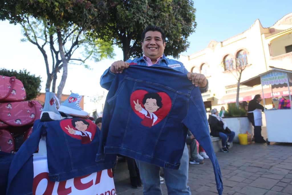 Zapateros de San Mateo Atenco se unen al proceso electoral comercializando bolsas, chamarras de mezclilla y tenis con la imagen de la precandidata de Morena, Delfina Gómez.