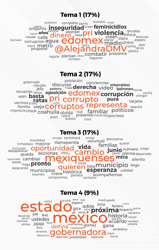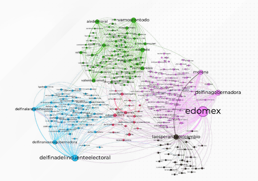 Además, se identifican narrativas de apoyo a las candidatas, donde la comunidad pro-Delfina Gómez la muestra como la candidata del cambio y la esperanza para los mexiquenses, mientras que la comunidad pro Alejandra atribuye a su candidata cualidades como «experiencia», «juventud», «conocimiento».