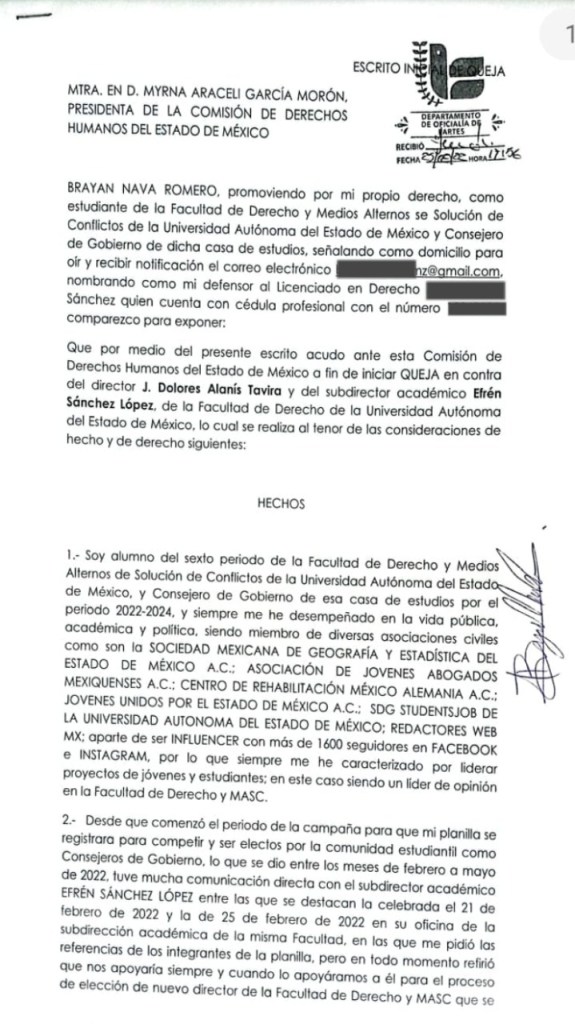 El estudiante de la Facultad de Derecho presentó una queja ante la Comisión de Derechos Humanos del Estado de México, señalando al director J. Dolores Alanís Tavira y al subdirector académico, Efrén Sánchez López, luego de que este último presuntamente lo grabara sin su consentimiento y abusara de su cargo para intimidar.