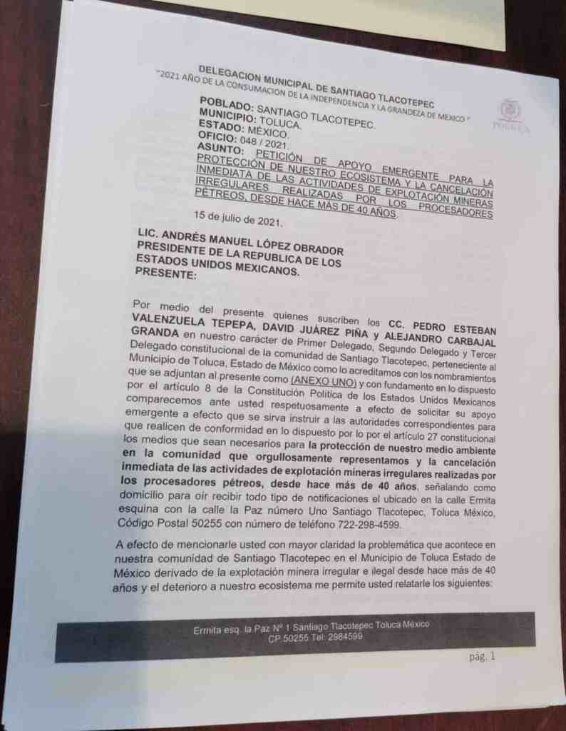 «Manifestamos a usted Señor presidente y a las autoridades federales que el impacto ambiental negativo producto de la sobre explotación minera tiene una consecuencia negativa, es directa en un sentido acumulativo, de igual manera sinérgico (…) Motivo por el cual solicitamos su emergente apoyo a efecto de que integrantes de nuestras comunidades dejen de ser afectados por principio en cuanto al medio ambiente que nos rodea y que a decir de estudios ecológicos somos los pulmones del Estado de México«.