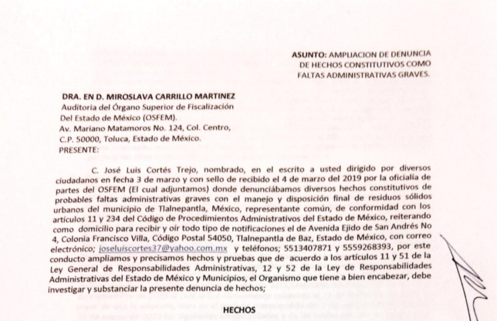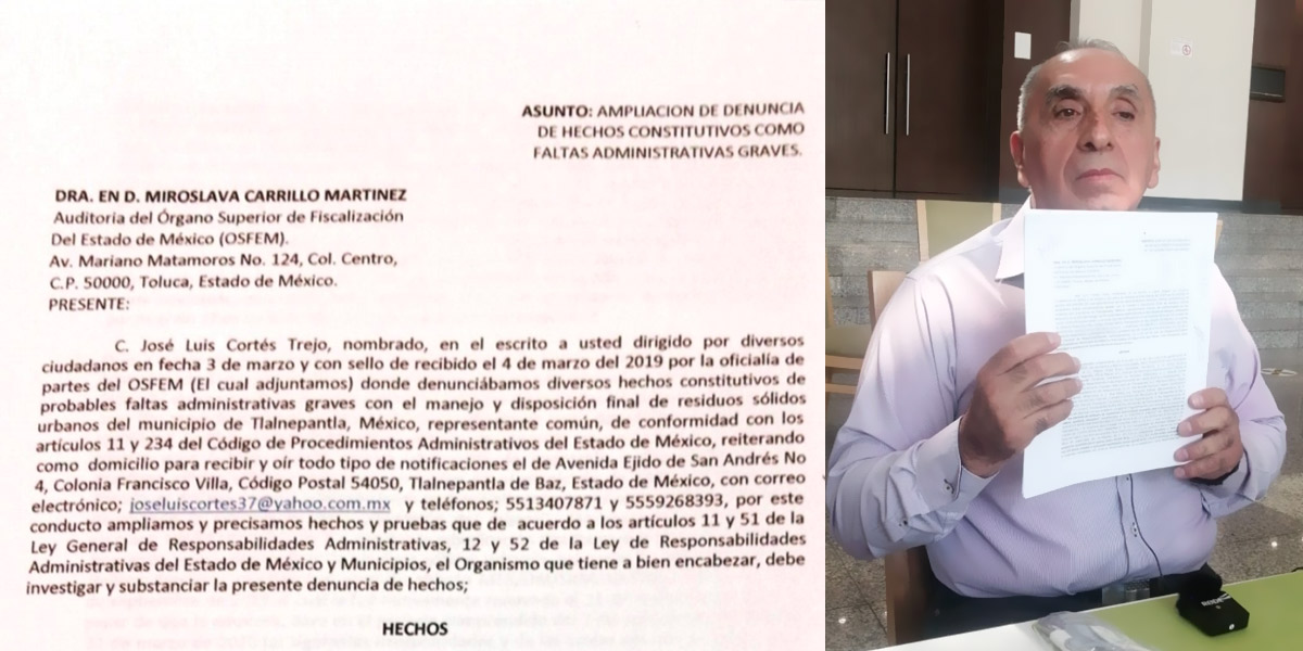 A través de una denuncia interpuesta ante el Órgano Superior de Fiscalización del Estado de México (OSFEM), el exregidor de Tlalnepantla José Luis Cortés Trejo acusó a la actual administración municipal de Raciel Pérez Cruz por supuestas irregularidades en los pagos realizados a la empresa encargada de operar el relleno sanitario de la localidad.