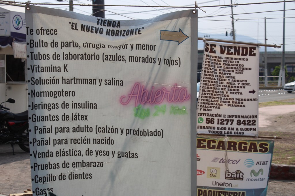 Enfrente de este último hospital se encuentra un pequeño tianguis de medicamentos e insumos para procedimientos y estudios, como bolsas de parto y cirugía mayores, tubos de laboratorio, soluciones hartman y todo tipo de material quirúrgico.