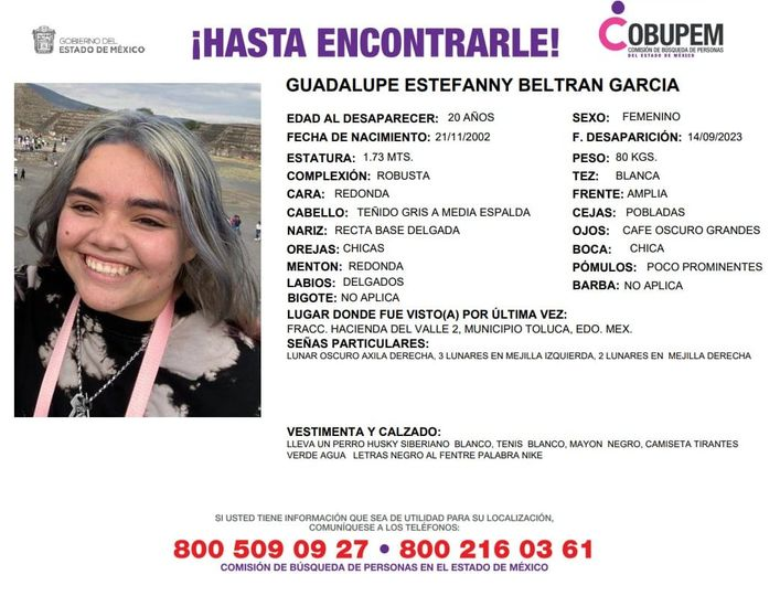 De acuerdo con la Comisión de Búsqueda de Personas del Estado de México (COBUPEM), Guadalupe Estefanny desapareció el jueves 14 de septiembre en Toluca.